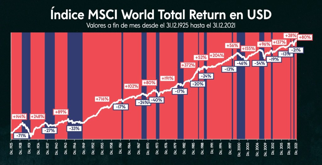El MSCI refleja desde el año 1925 hasta hoy , todas las épocas de decrecimiento (en Azul en el gráfico) y de crecimiento (en Rojo en el gráfico) que han sucedido. En él podemos ver reflejado desde el Crack del 29, La Segunda Guerra Mundial (1939-1941), La Crisis del Petróleo de 1973, Lunes Negro de 1987, el 11S de 2001, La Quiebra de Lehman de 2008, La Crisis del Brexit de 2016, La Pandemia del Covid de 2020 y muchos acontecimientos más. Estos acontecimientos nos han brindado oportunidades para comprar, por ejemplo, participaciones de fondos a precios muy bajos. Esto, siempre diversificando en varios fondos recomendados por un asesor, que te conozca bien a ti y tus necesidades. De modo que te cree una cartera de fondos adecuada a tu perfil y muy bien diversificada, donde las proporciones geográficas, sectoriales, de tipos de activo etc…y la estrategia de inversión utilizada, sean las correctas para anclar tu patrimonio a la economía global en el medio y largo plazo y aprovechar estas Crisis = Oportunidades. La única manera para conseguir más buenos resultados en nuestras rentabilidades; cuando después del Azul (bajada), ha venido el periodo marcado en Rojo (subida), nuestro patrimonio ha podido crecer de forma considerable, como veis en el gráfico, por ejemplo , el 11S de 2001 bajada de -46% con una posterior subida del +155%.